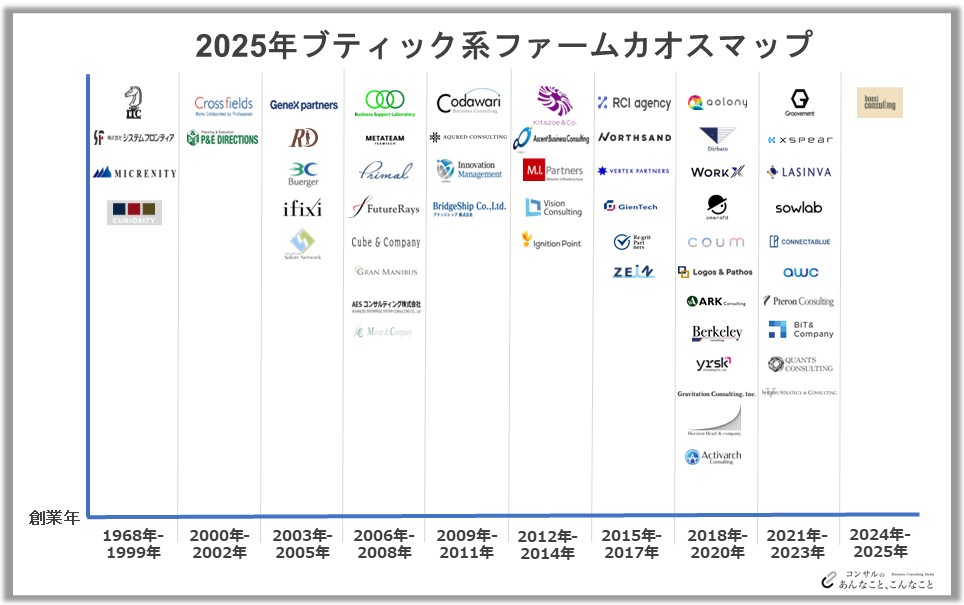 創業年を軸に並べたブティックファームのリストを見ていくと、それぞれの時代背景や市場のニーズ、そしてコンサルティング業界の構造変化が浮かび上がってきます。